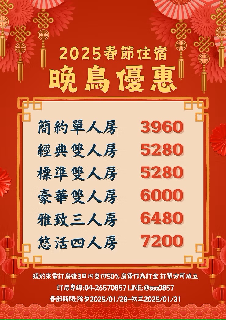 春節期間,早餐僅依房型設定人數數量提供,僅豪華雙人房可以提供2大2小-7歲以下