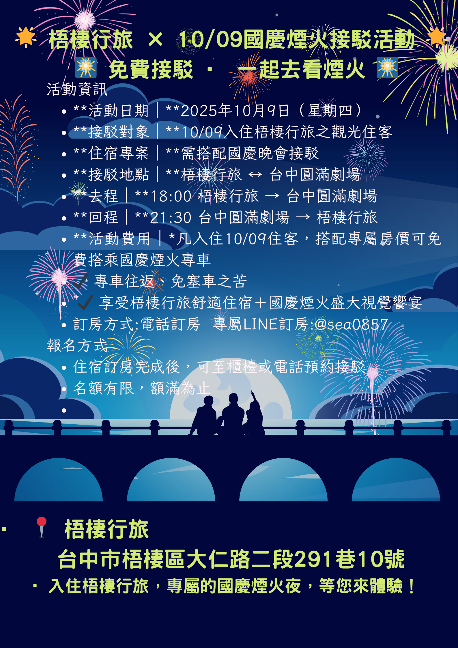 · ✔ 專車往返、免塞車之苦✔ 享受梧棲行旅的舒適住宿+國慶煙火的盛大視覺饗宴
