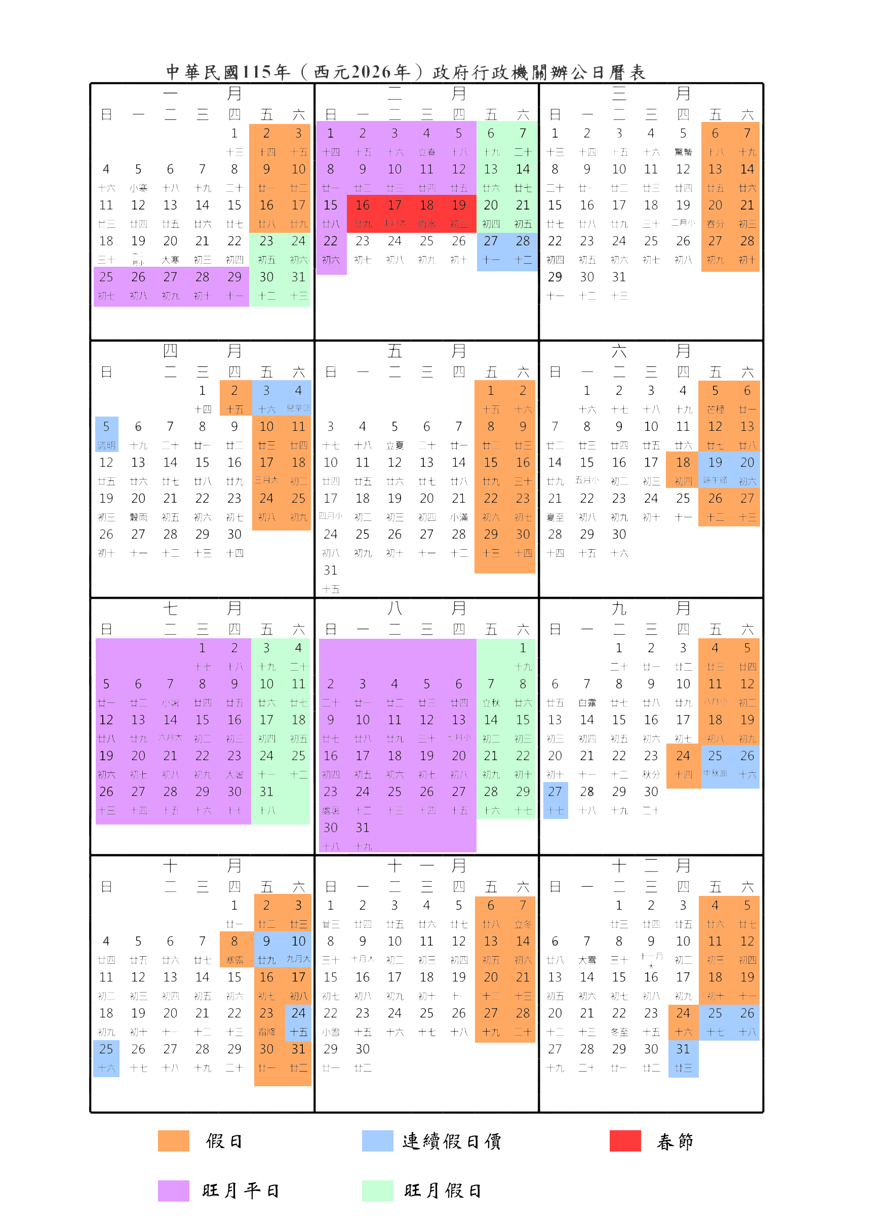 本行事曆已區分平日、假日、連續假期及春節期間,並以不同顏色標示,供訂房與行程安排參考。